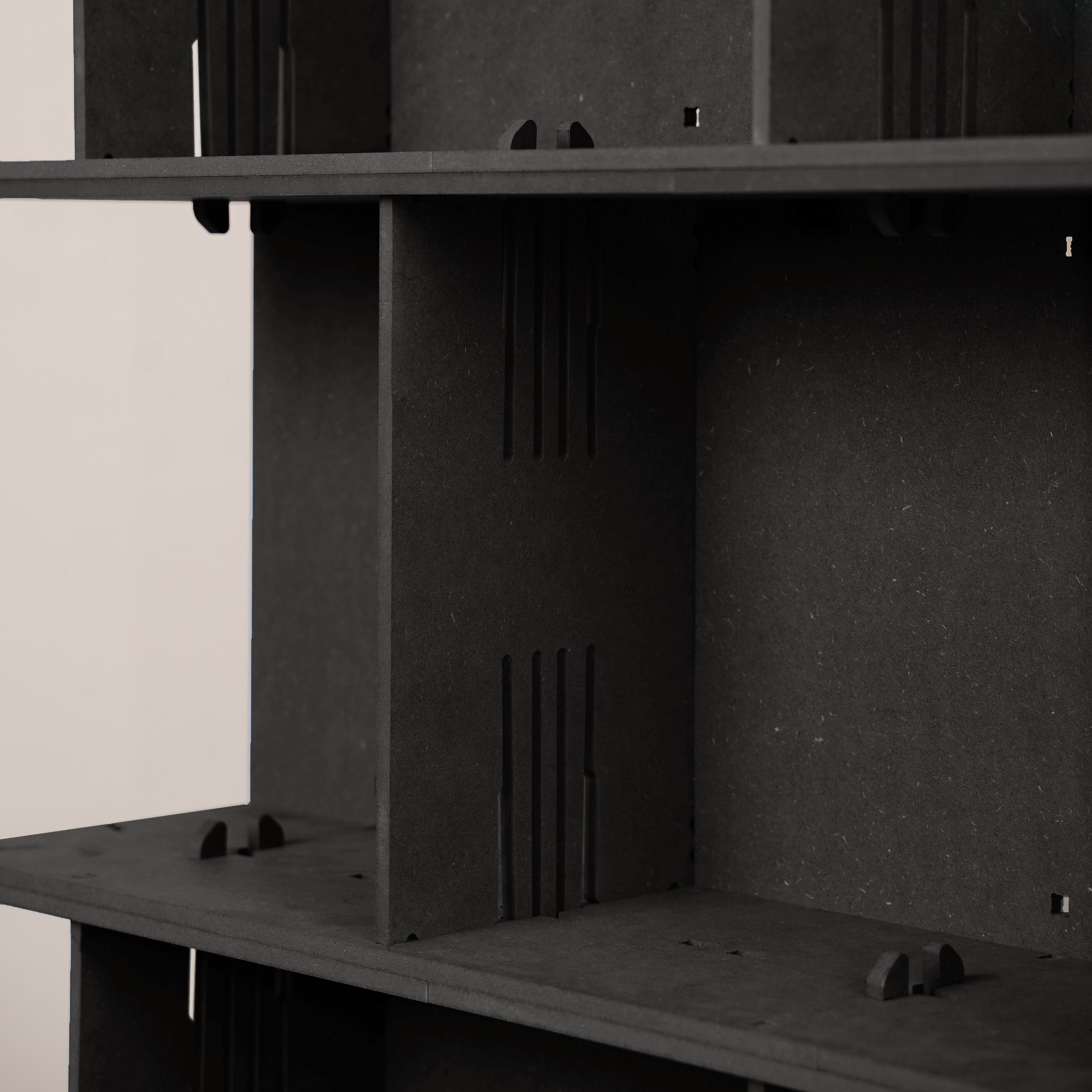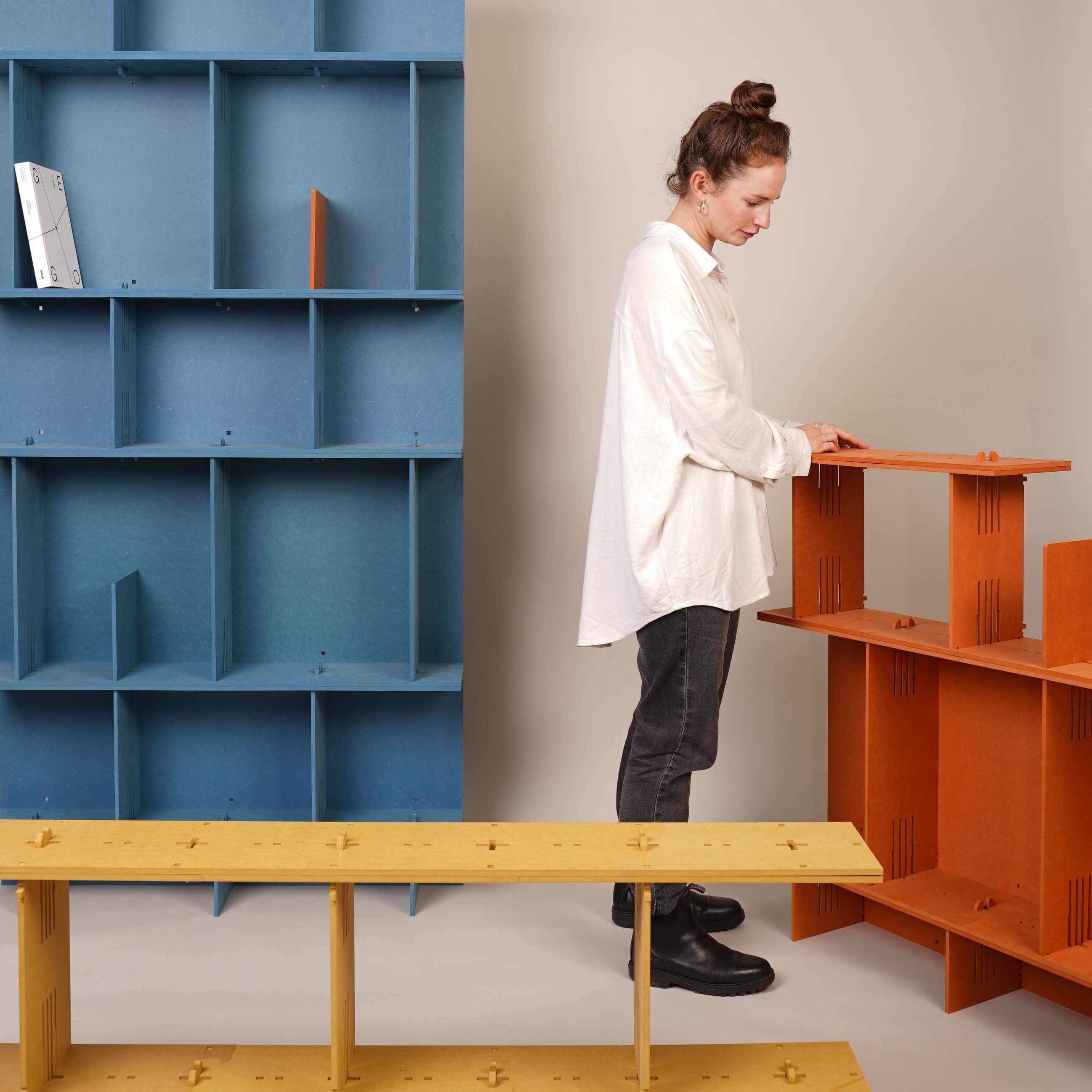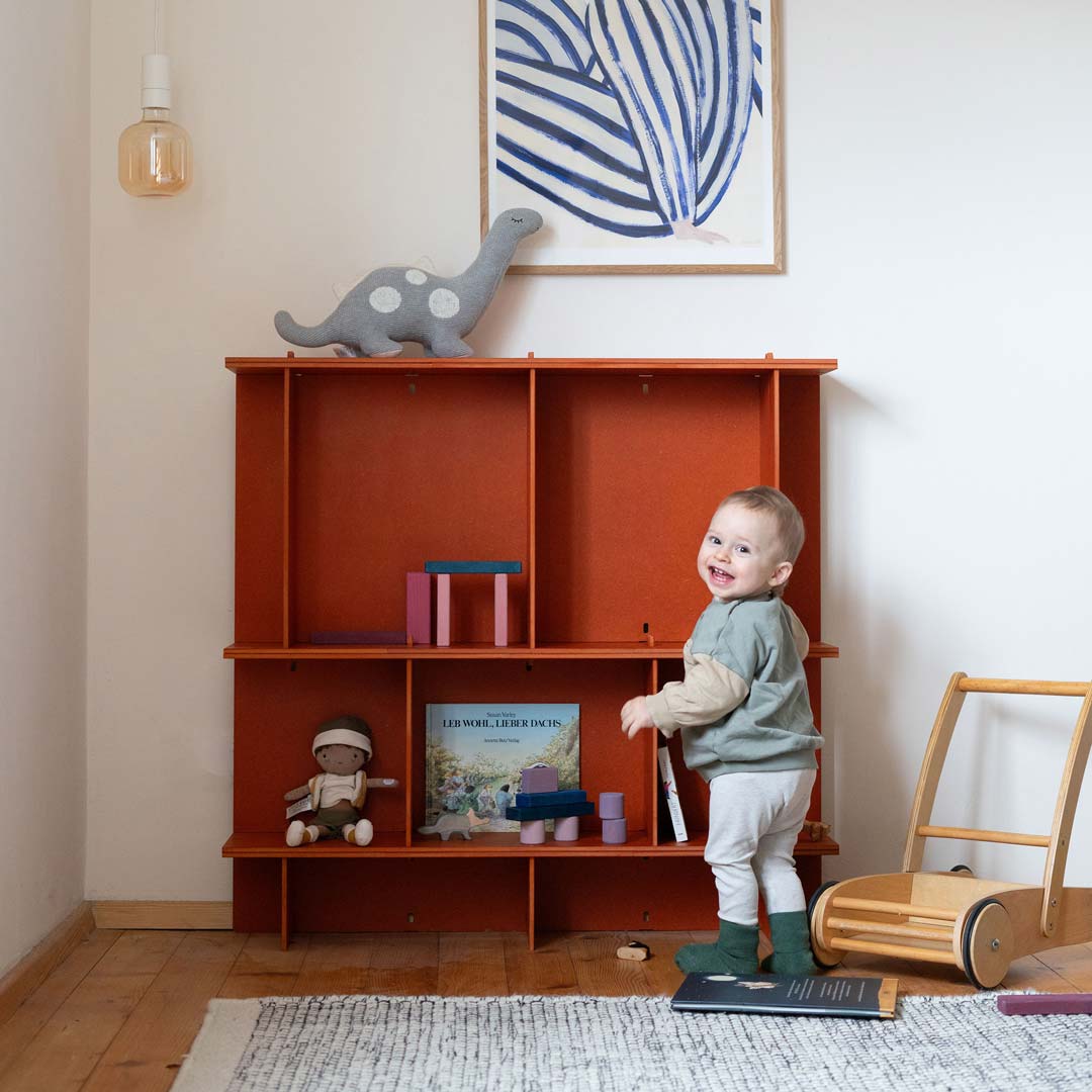 Unsere Möbel bestehen aus einem hochwertigen, durchgefärbten Holzwerkstoff, der die natürliche Haptik von Holz mit besonders hoher Formstabilität verbindet. Das Material ist robust, langlebig und ideal für den täglichen Gebrauch – eine bewusste Entscheidung für Funktionalität, Design und Langlebigkeit. So entsteht ein modulares Regalsystem, das dich zuverlässig durch alle Lebensphasen begleitet.